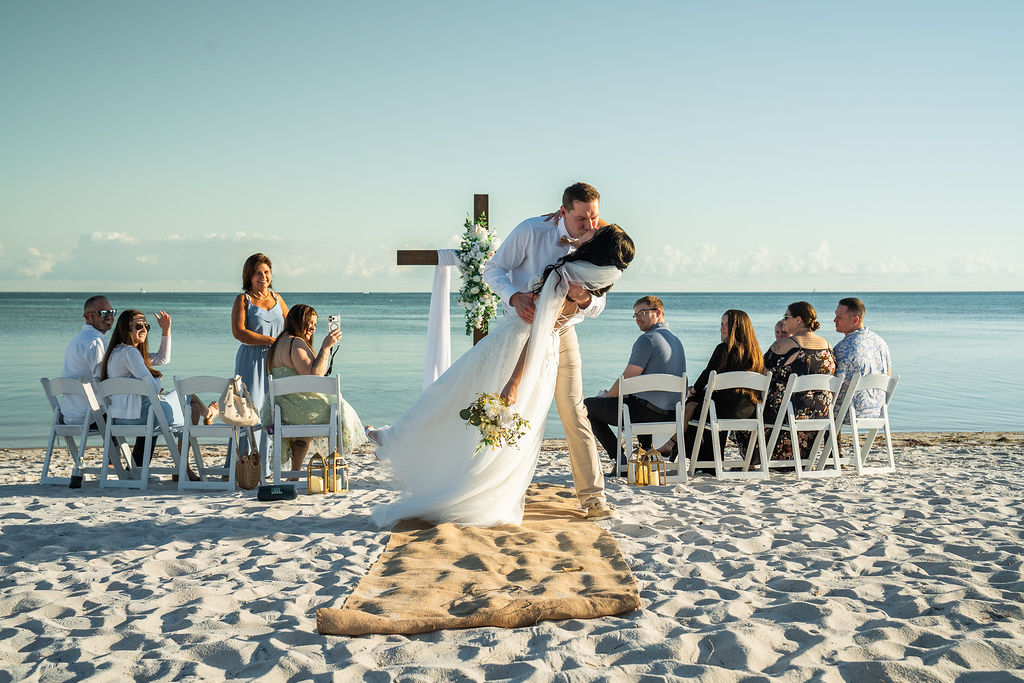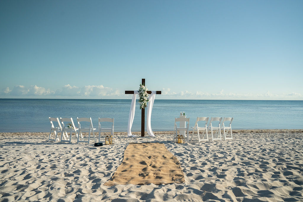 For their elopement, the couple chose a timeless and Christ-centered ceremony design that blended seamlessly with the shoreline of Smathers Beach. A wedding cross draped in soft white fabric and accented with white florals stood as the focal point, symbolizing faith, love, and commitment.
