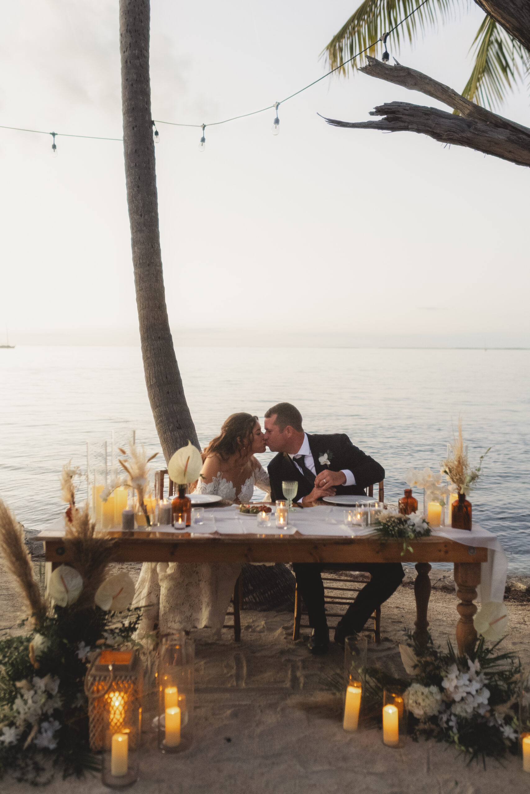 The reception design highlighted a mix of round white-linen tables and farmhouse tables styled with brown milk-glass florals, hints of pampas grass, and bamboo chairs. Jade also envisioned a dramatic, candle-heavy sweetheart table—and the glowing layers of candlelight with the ocean in the backdrop created a truly magical setting.